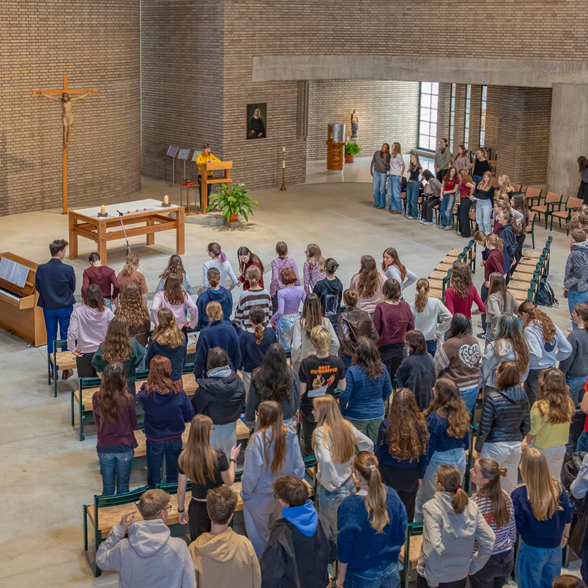 Unter der Leitung von Simon Kaufmann singen sich fünf junge Frauen auf der Bühne in der Aula ein. Sie werden an der Feier drei Musikstücke vortragen.