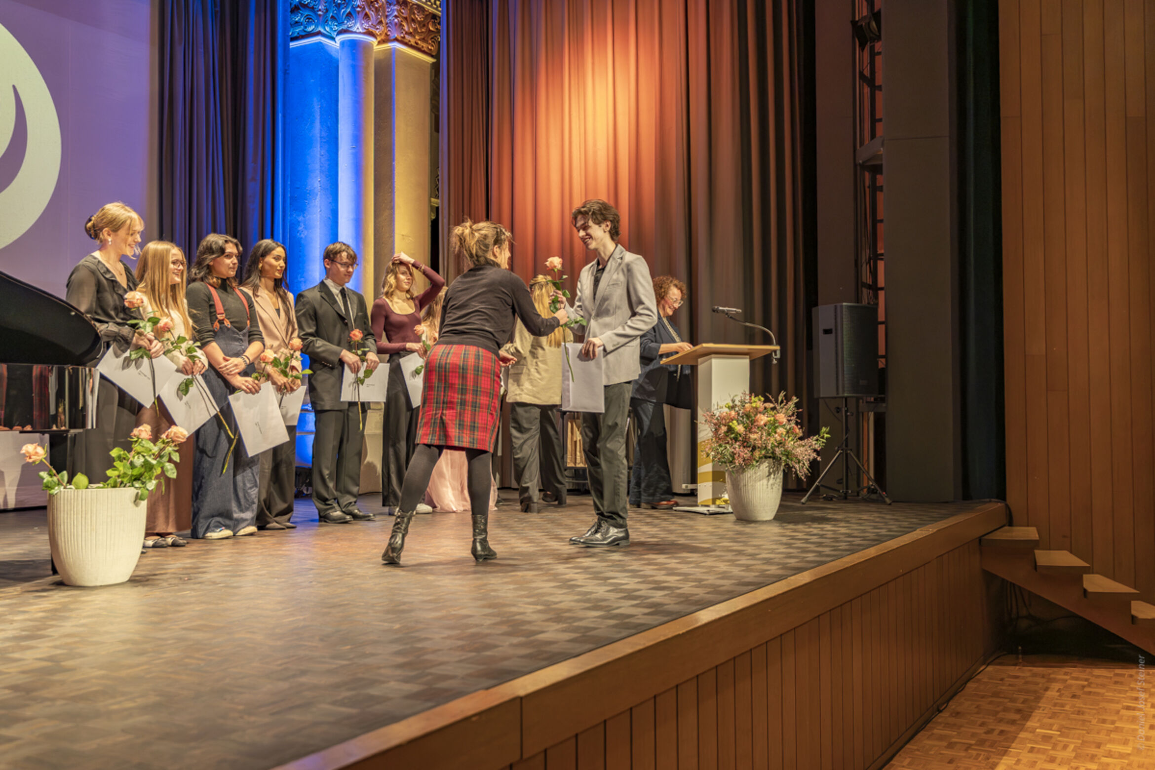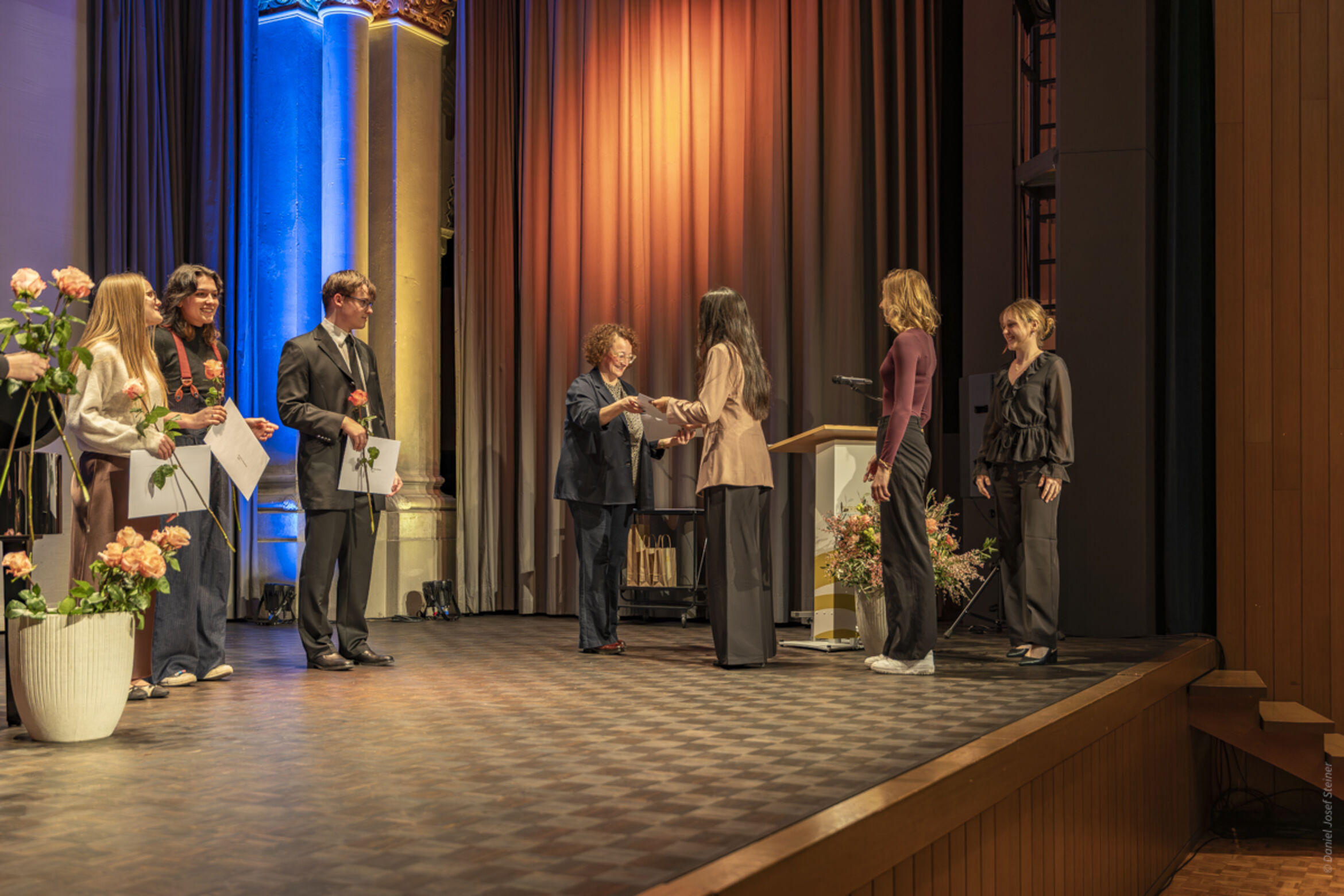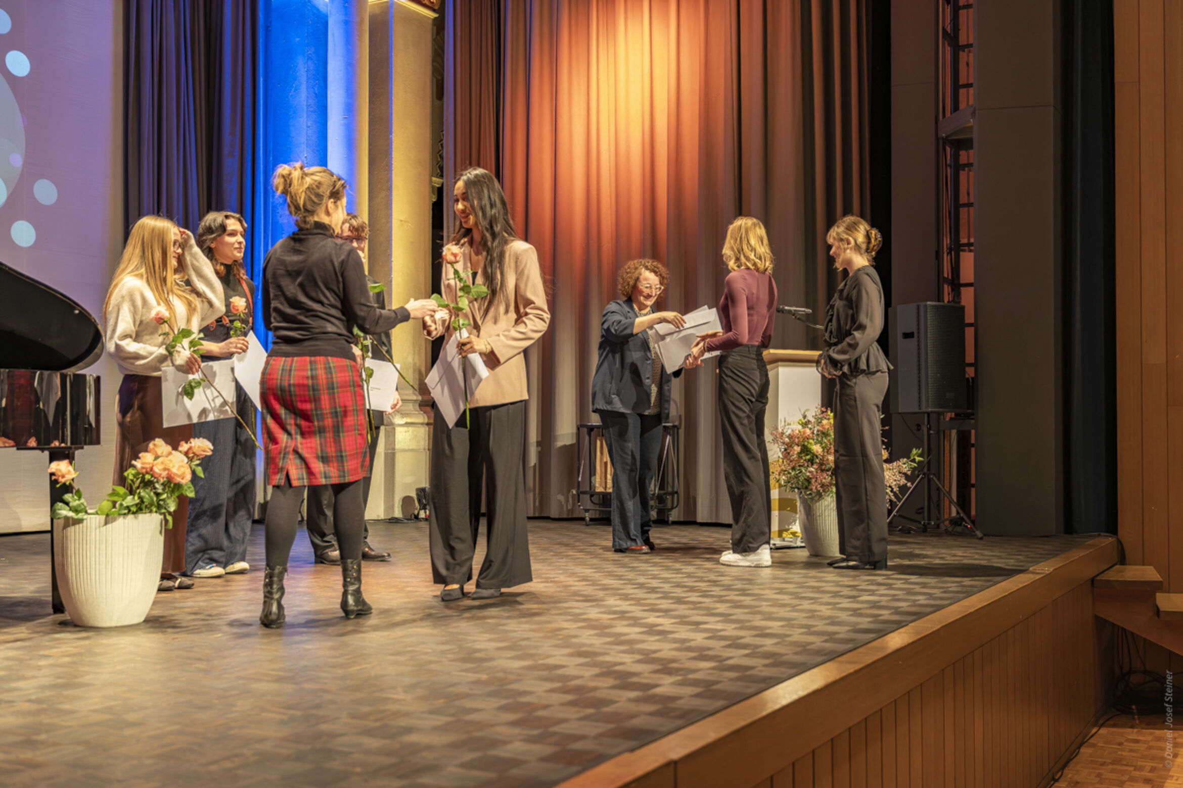 Die beiden Fachmittelschülerinnen Riana Baumann und Amélie Scheuber bereichern die Feier mit ihrem musikalischen Talent und verleihen ihr so einen festlichen Glanz. Begleitet und unterstützt werden sie dabei von Nathalie Nussbaumer, Musiklehrerin am Theresianum.