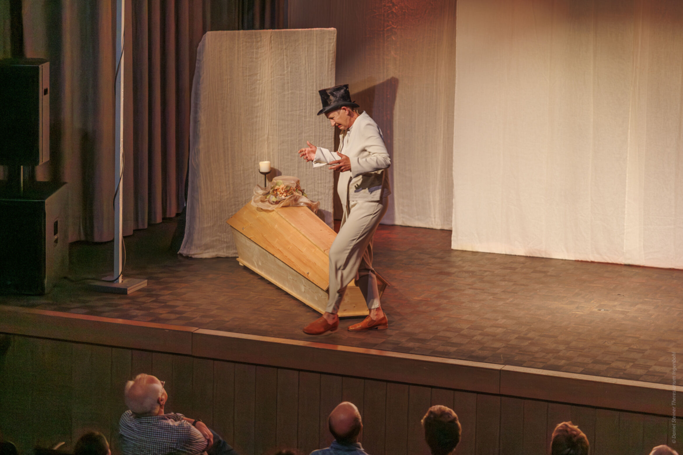 Kultur Brunnen bringt Annette Windlins Fassung der alten Dame auf die Theresianum-Bühne. Vor fast ausverkauftem Haus hebt Claire ihren Hutschleier und die Geschichte nimmt auf tragikomische Weise ihren Lauf, so, dass den Zuschauenden immer wieder der Atem stockt.