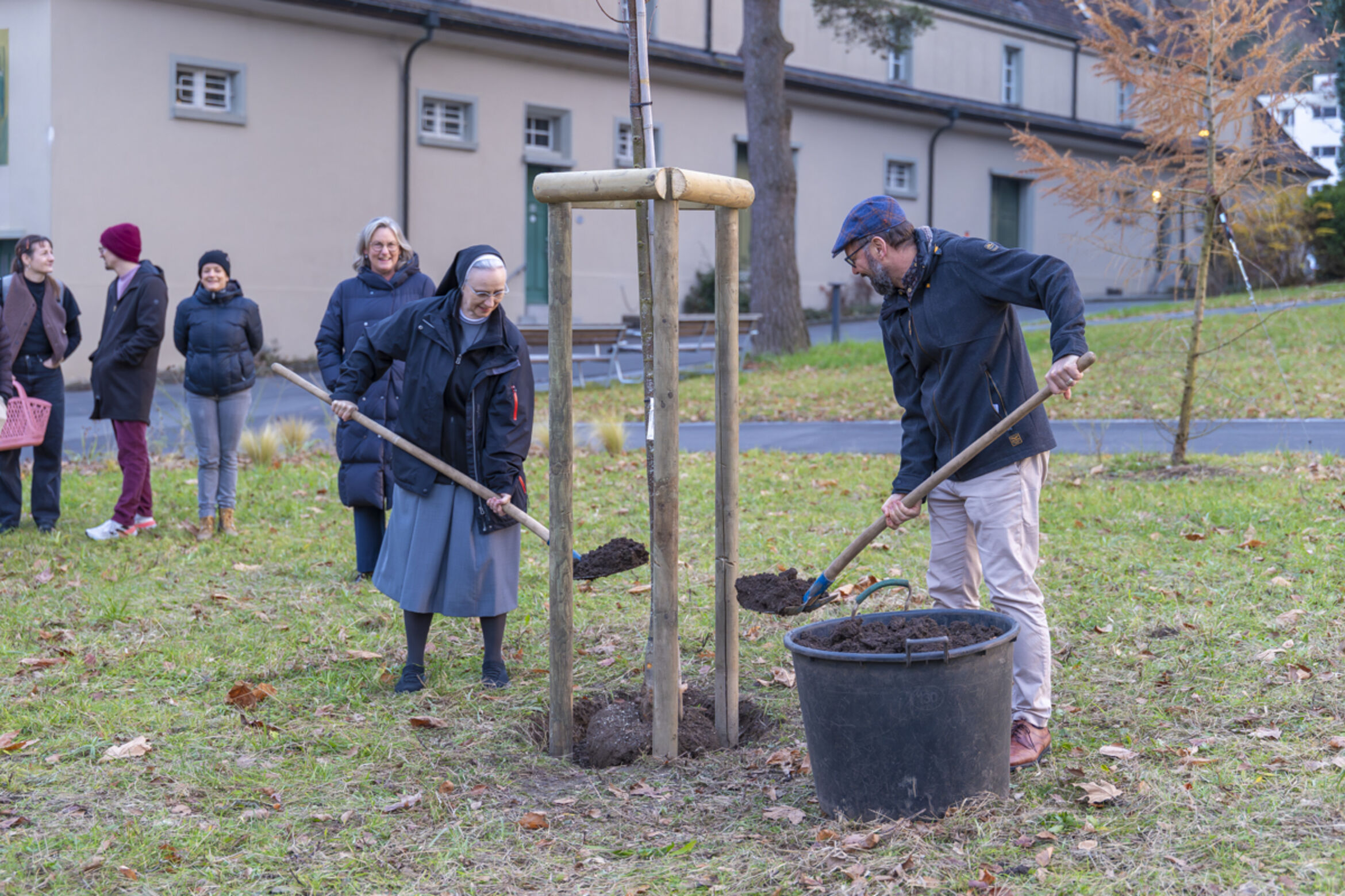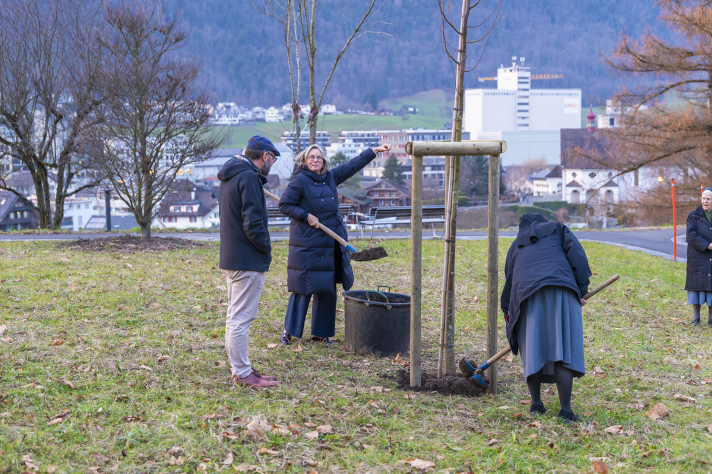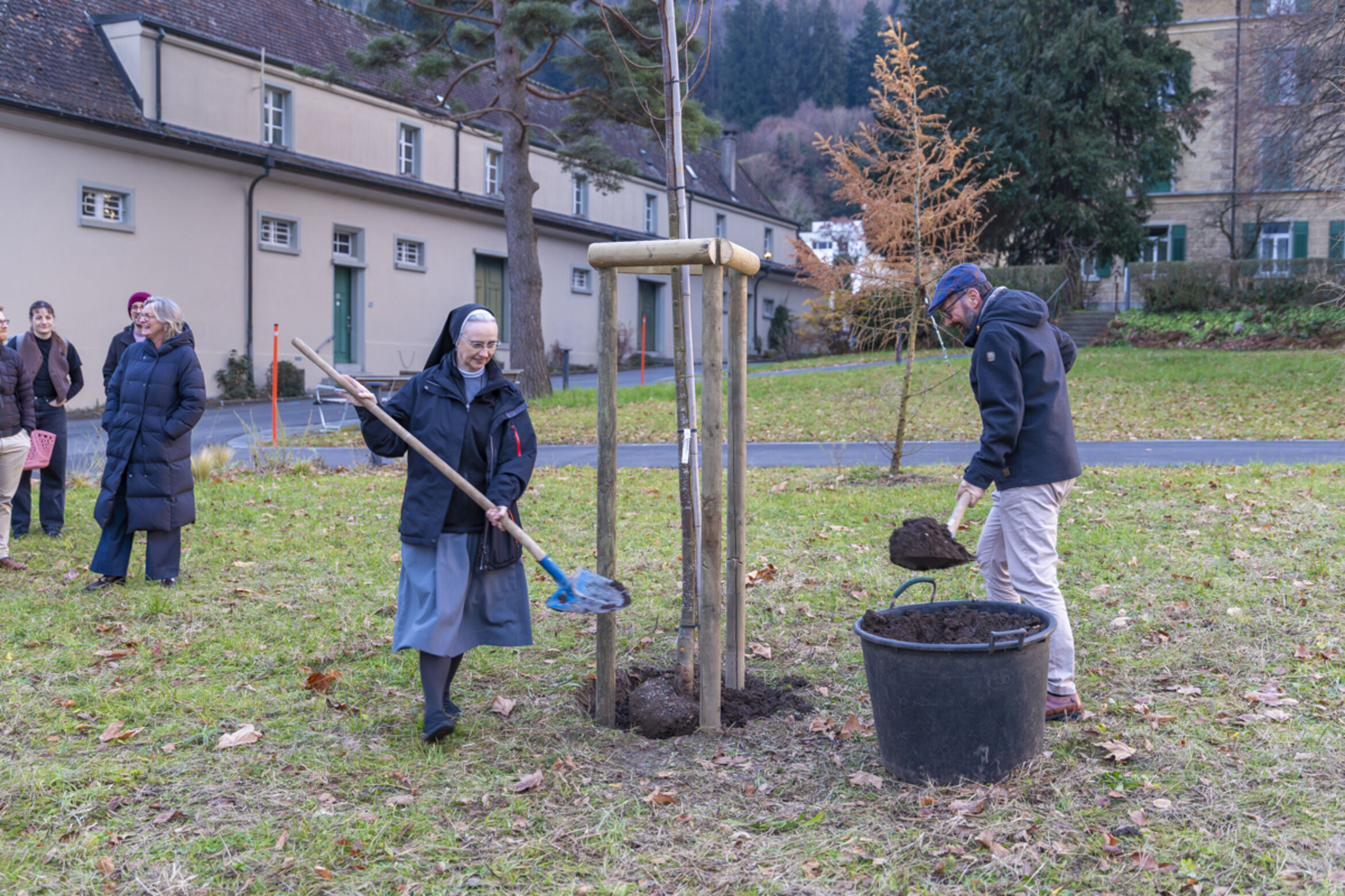 Anwesend waren neben der Rektorin der Schule auch der Stiftungsratspräsident René Baggenstos sowie die Oberin Sr. Tobia Rüttimann, beide Mitglieder des Stiftungsrats. Gemeinsam setzten sie den Baum als Zeichen der Verbundenheit und des Respekts vor dem Wirken Mutter Maria Theresias. Ihr berühmtes Zitat «Das Gramm Gold entdecken, das in jedem Menschen verborgen ist» hallte dabei symbolisch mit: Die Winterlinde, bekannt für ihre Langlebigkeit und Widerstandsfähigkeit, soll künftig nicht nur den Park bereichern, sondern auch an diesen Auftrag erinnern.